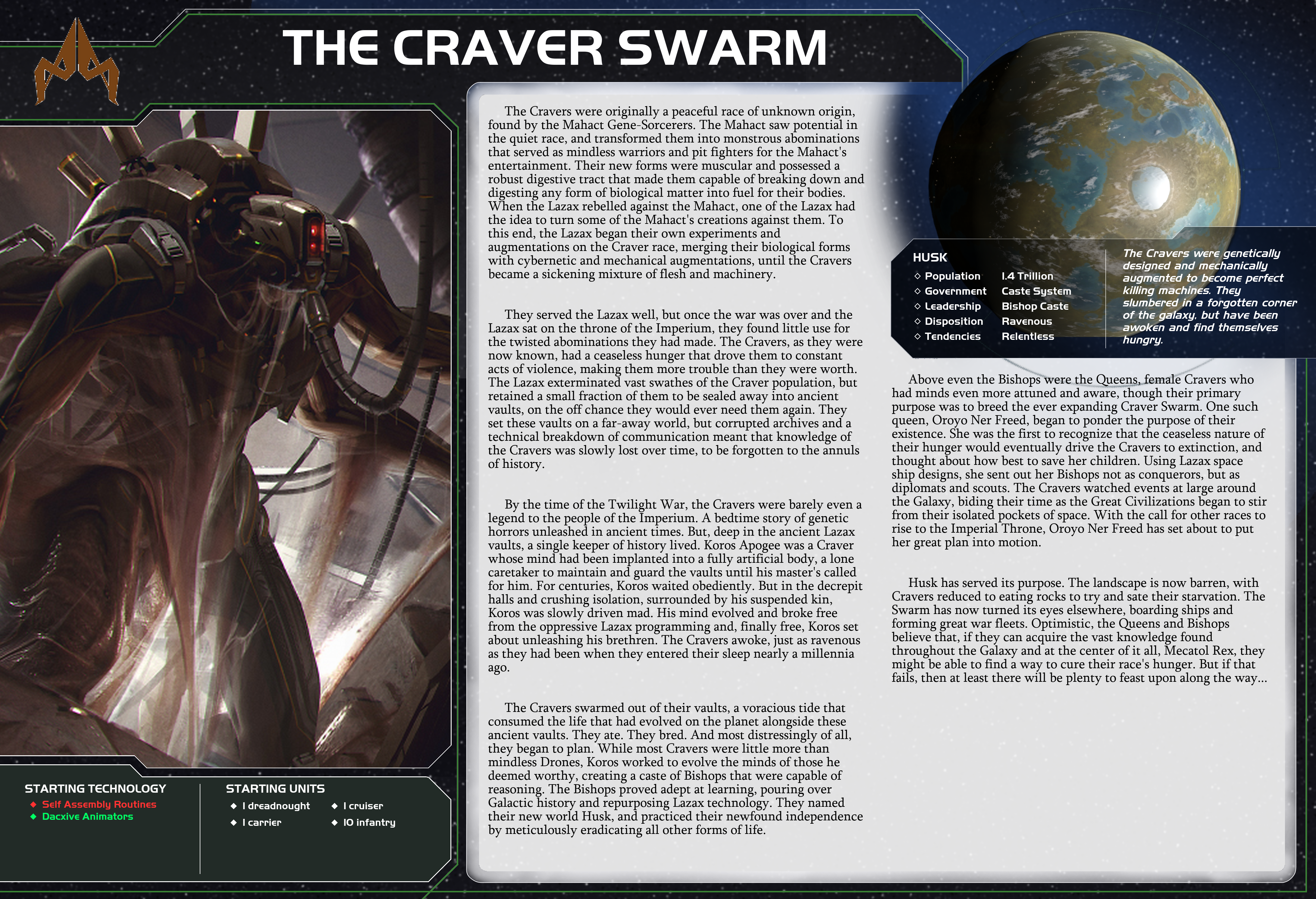 This unit's PRODUCTION value is equal to 3 more than the resource value of this planet. Up to 3 fighters in this system do not count against your ships' capacity. When you take control of a planet, you may destroy four of your infantry in that planet's system to place a space dock there.