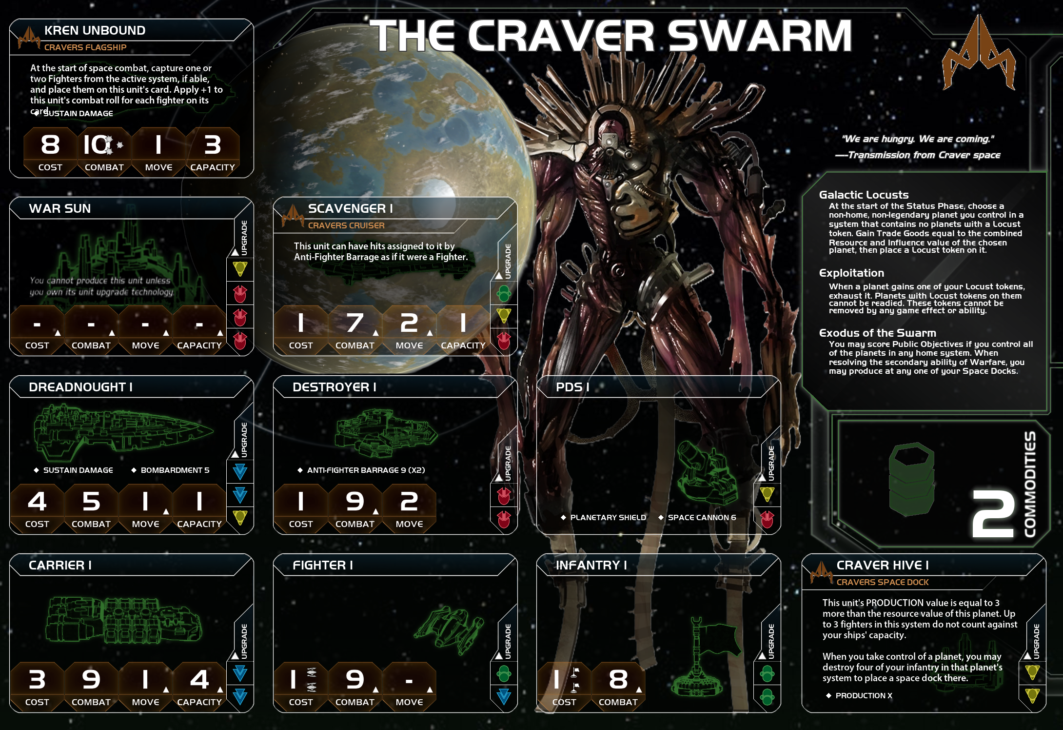 - Galactic Locusts: At the start of the Status Phase, choose a non-home, non-legendary planet you control in a system that contains no planets with a Locust token. Gain Trade Goods equal to the combined Resource and Influence value of the chosen planet, then place a Locust token on it.