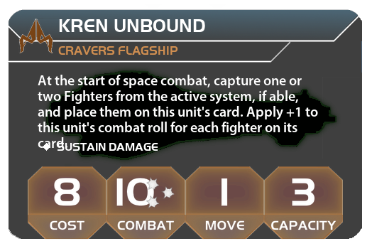 At the start of space combat, capture one or two Fighters from the active system, if able, and place them on this unit's card. Apply +1 to this unit's combat roll for each fighter on its card.